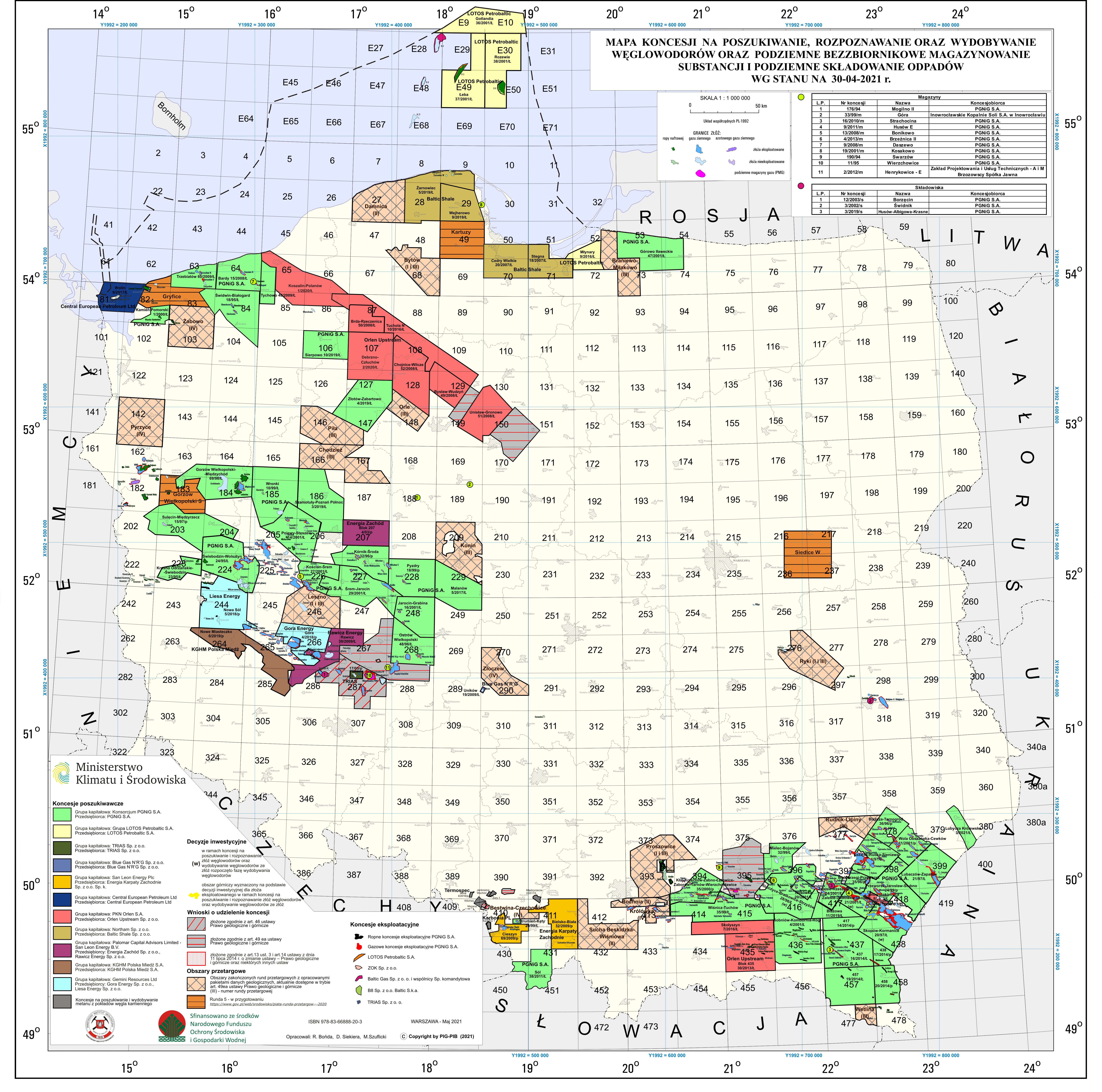 Map of concessions for hydrocarbon exploration and production, and non - reservoir storage of substances in the subsurface and storage of wastes in the subsurfacedata: 2021-10-01, rozmiar: 6 MB