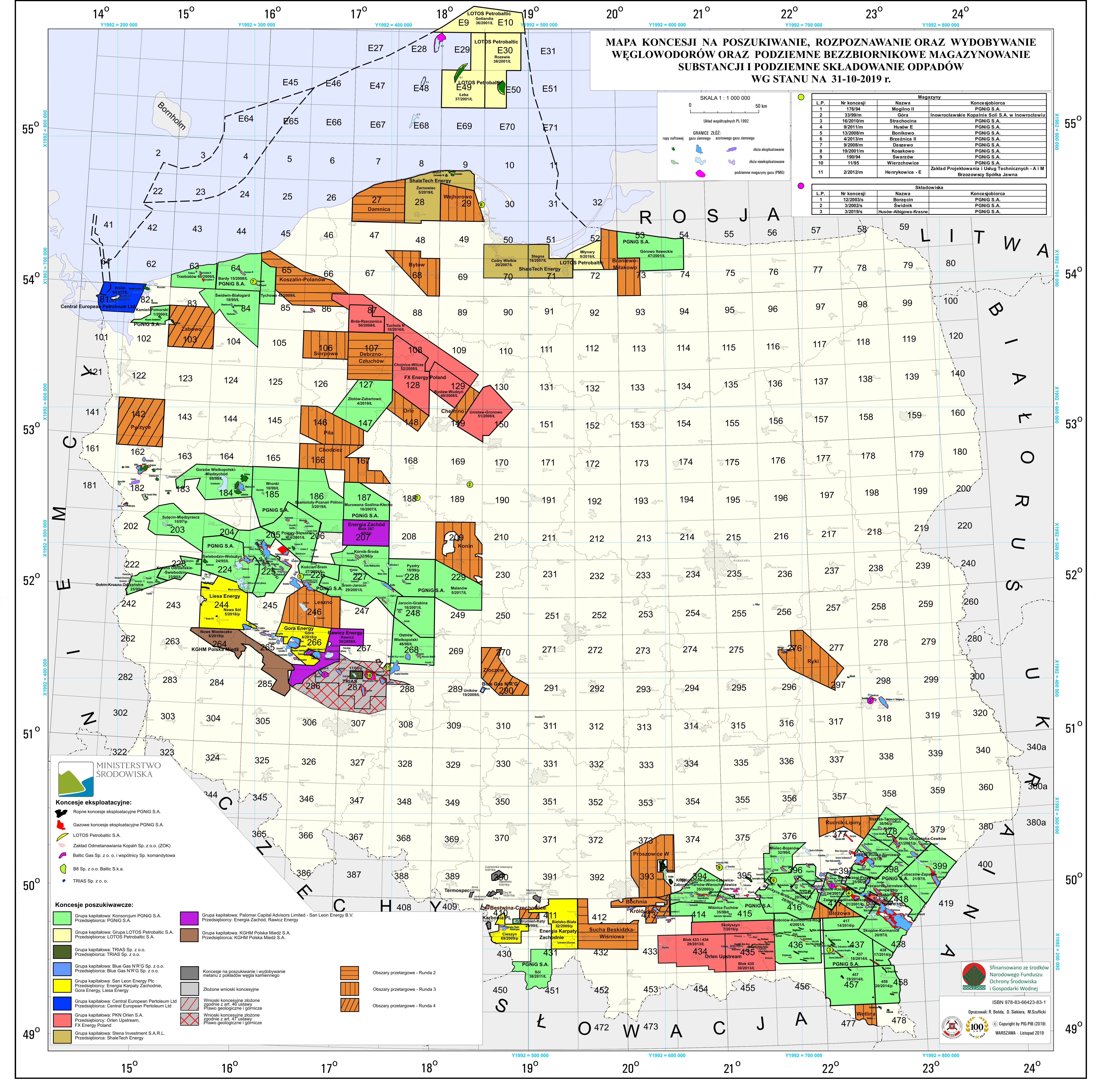 Map of concessions for hydrocarbon exploration and production, and non-resorvoir storage of substances in the subsurface and storage of wastes in the subsurfacedata: 2019-11-26, rozmiar: 5 MB