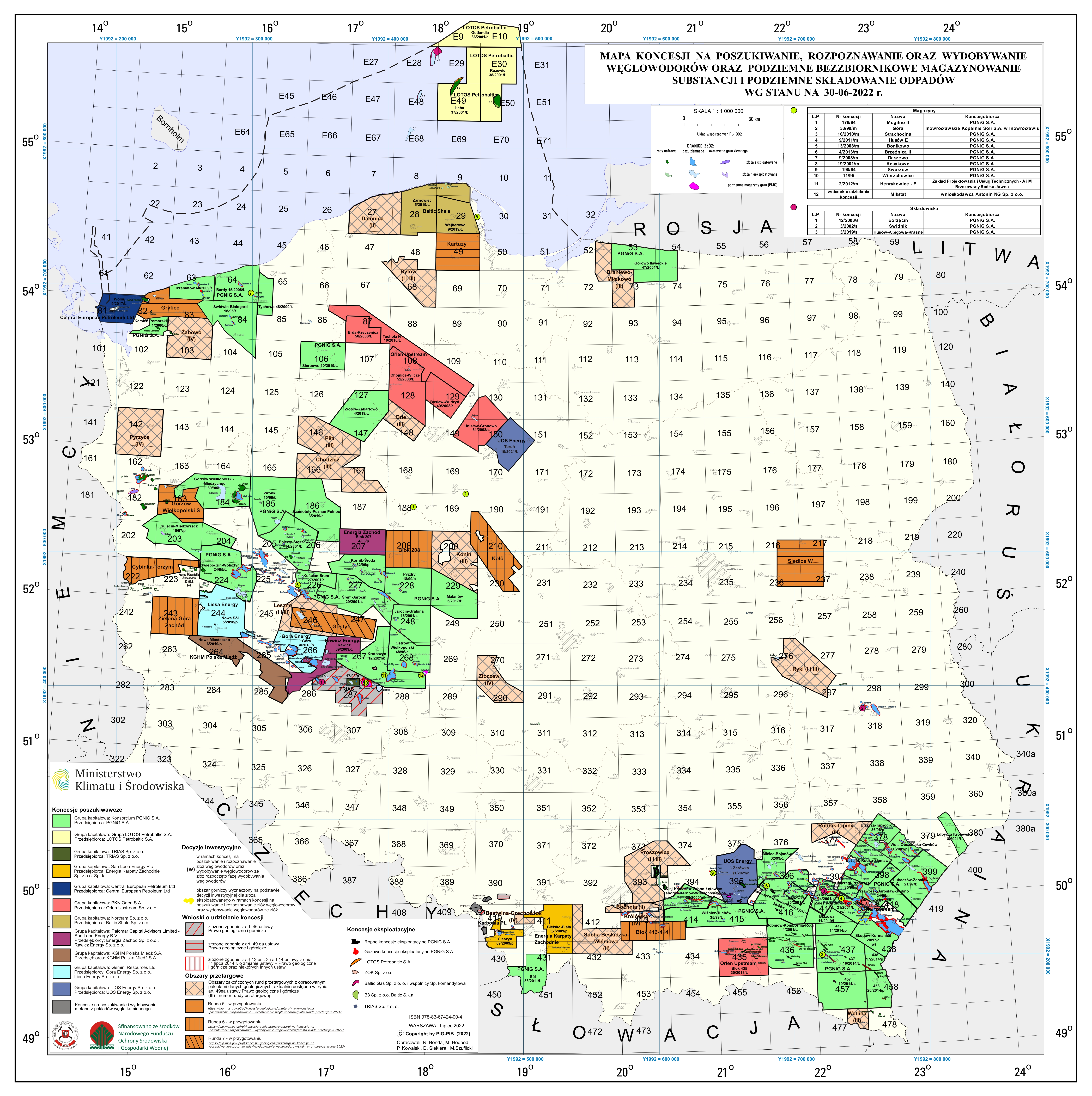 Map of concessions for hydrocarbon exploration and production, and non-reservoir storage of substances in the subsurface and storage of wastes in the subsurfacedata: 2022-07-15, rozmiar: 12 MB