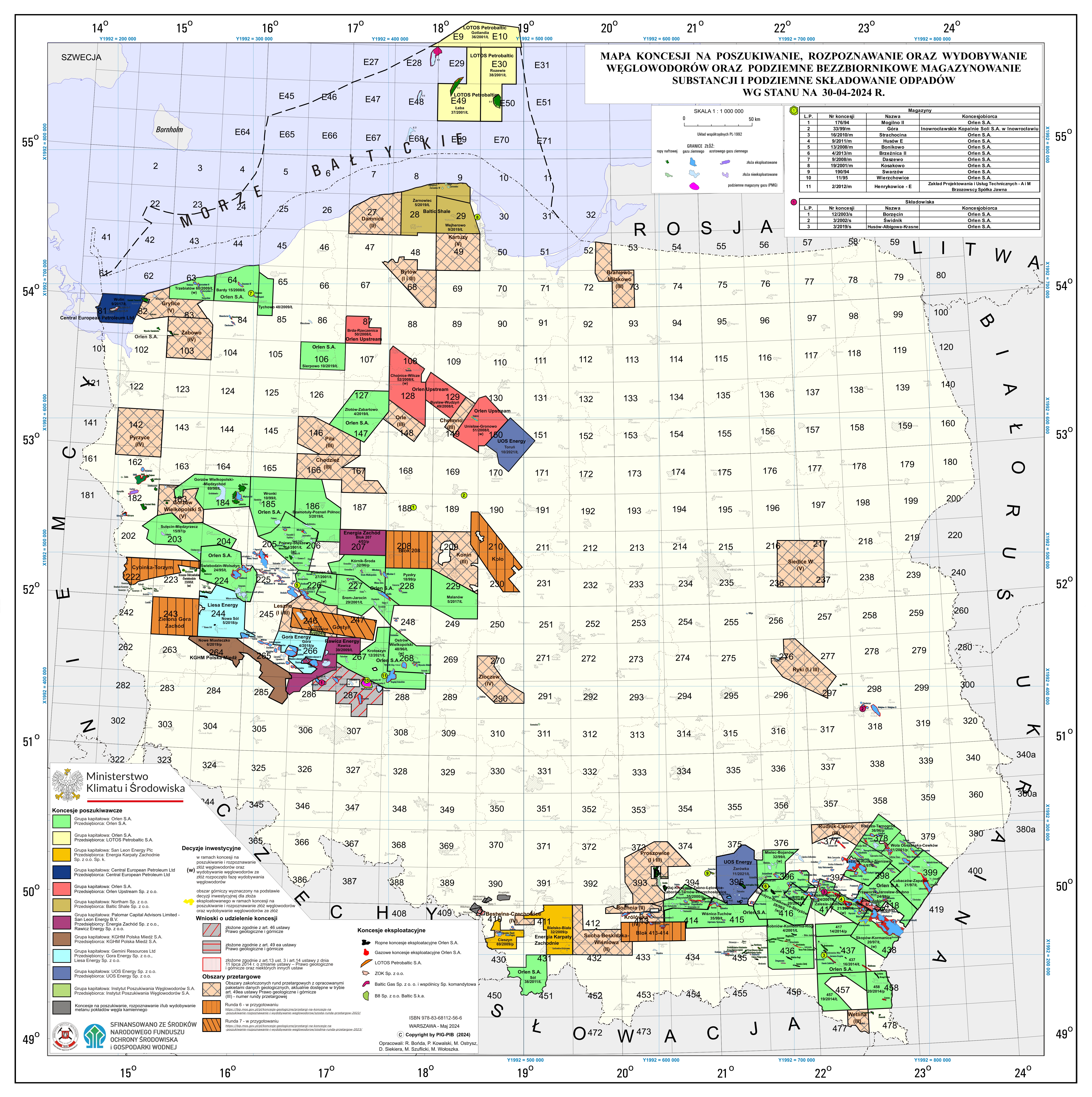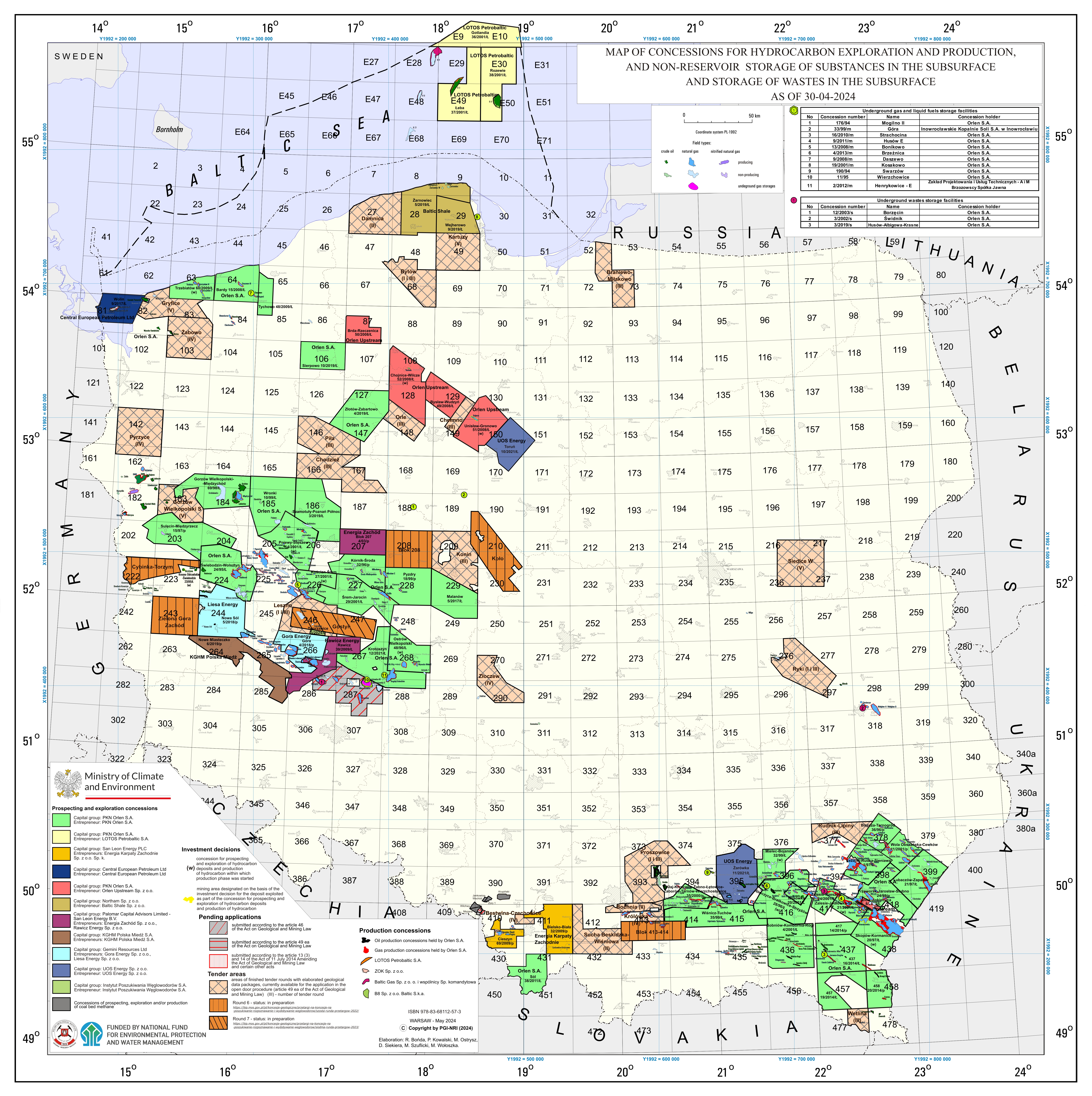 Map of concessions for hydrocarbon exploration and production, and non-reservoir storage of substances in the subsurface and storage of wastes in the subsurfacedata: 2024-05-22, rozmiar: 12 MB