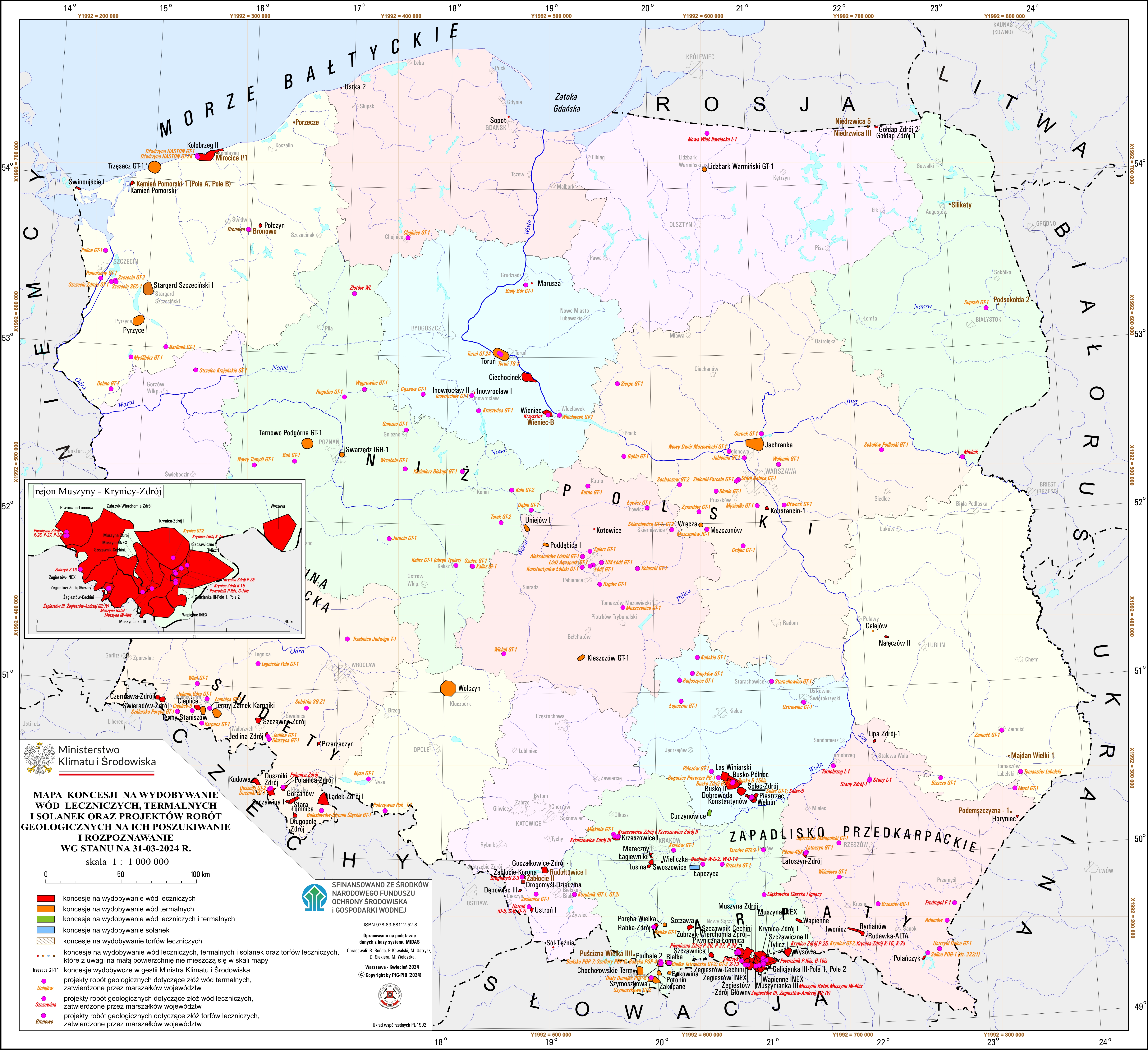 Map of brines, curative and thermal waters production licences, and geological works projects for their searching and identifyingdata: 2024-04-18, rozmiar: 9 MB