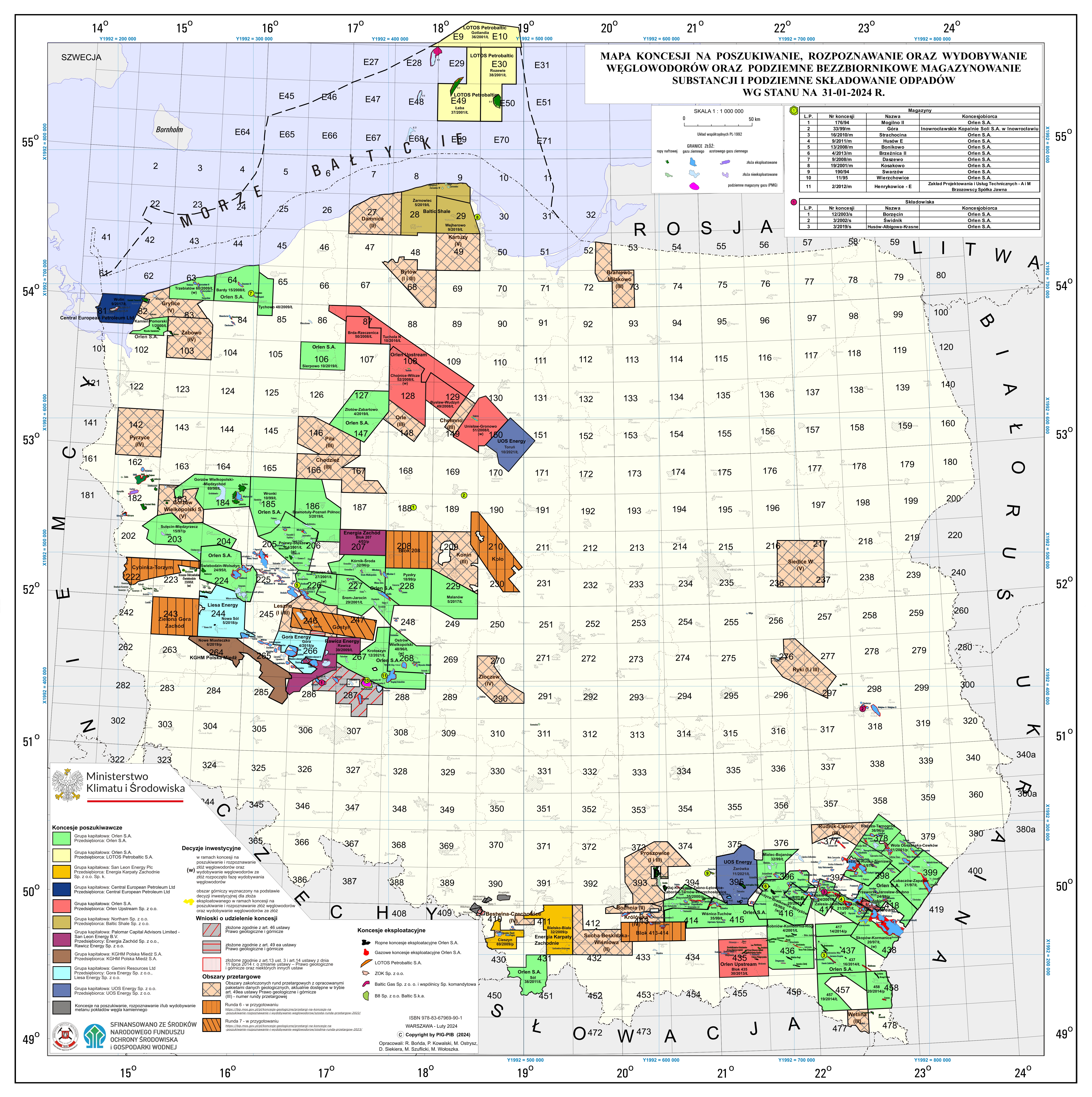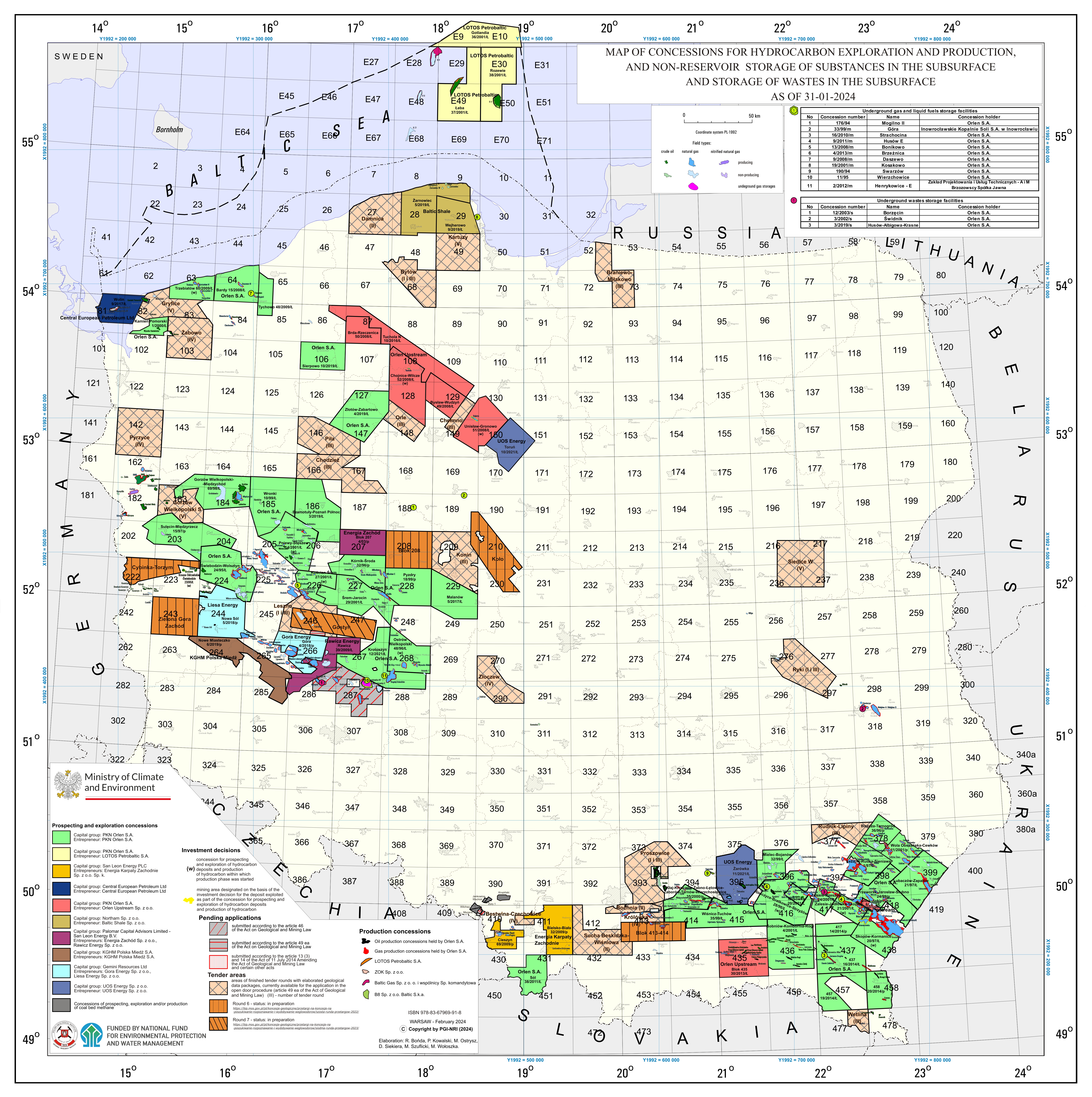 Map of concessions for hydrocarbon exploration and production, and non-reservoir storage of substances in the subsurface and storage of wastes in the subsurfacedata: 2024-02-21, rozmiar: 12 MB